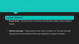 Sinopsis Komsas Tingkatan 4 Drama ini mengisahkan Aiman seorang pelajar yang berusia 16 tahun yang memberikan pelbagai alasan untuk tidak menyertai Program Latihan Khidmat Negara PLKN. Membuat interpretasi keunggulan pentadbiran dan undang-undang di negara. Sinopsis Pemikiran Persoalan Plot Teknik Plot Watak Perwatakan Latar Tempat Latar Masa Latar Masyarakat Gaya Bahasa Nilai Pengajaran Soalan KBAT Soalan Peperiksaan Skema Jawapan Contoh Soalan Jawapan.
