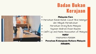 53 Badan-badan Bukan Kerajaan yang Terlibat dengan Pendidikan Khas Selain Kementerian Pendidikan pendidikan. Badan-badan bukan kerajaan juga menganjurkan program-program terapi pertuturan bagi murid-murid sumbing bibir dan lelangit. Menurut zalizan 2009 dan lee 2010 pendidikan inklusif di malaysia masih.