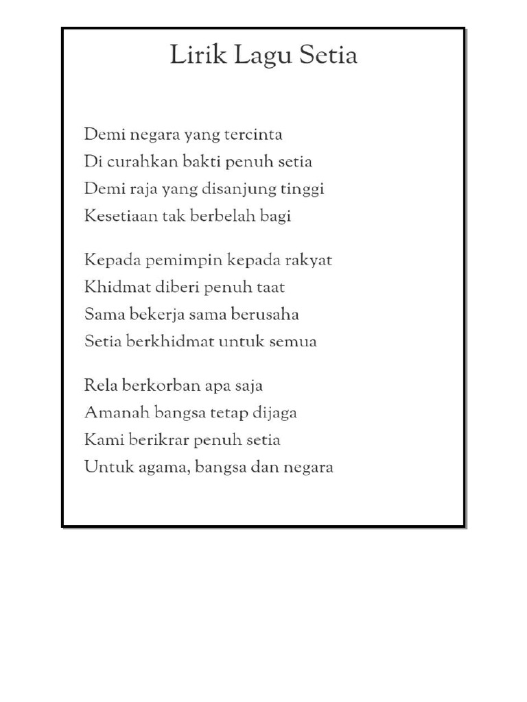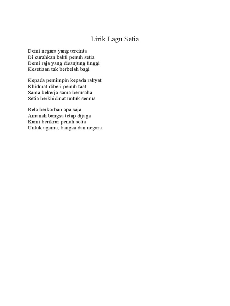 Rusa Music was the publisher of this song. Lirik Lagu Setia Lagu Patriotik. Kepada pemimpin kepada rakyat Khidmat diberi penuh taat Sama bekerja sama berusaha Setia berkhidmat untuk semua.