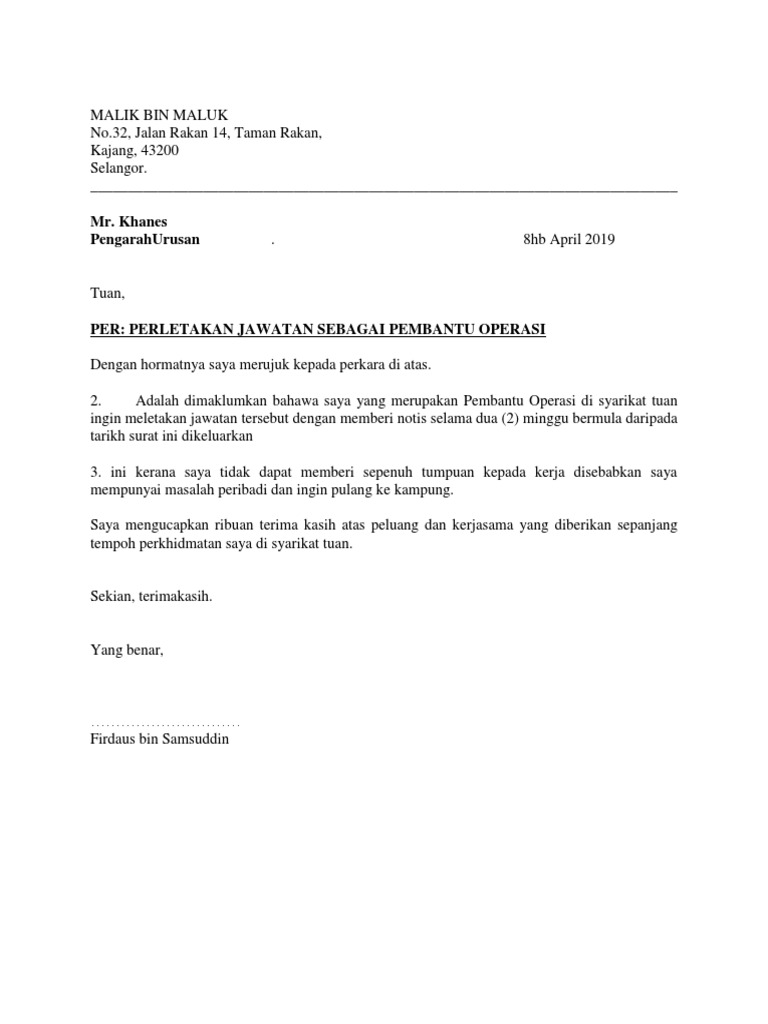 Jika ingin berhenti pastikan anda. Contoh Surat Berhenti Kerja Surat Perletakan Jawatan. Tapi disebabkan hal hal berkenaan saya telah mengambil keputusan untuk berhenti dengan notis 24 jam.